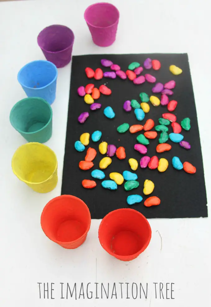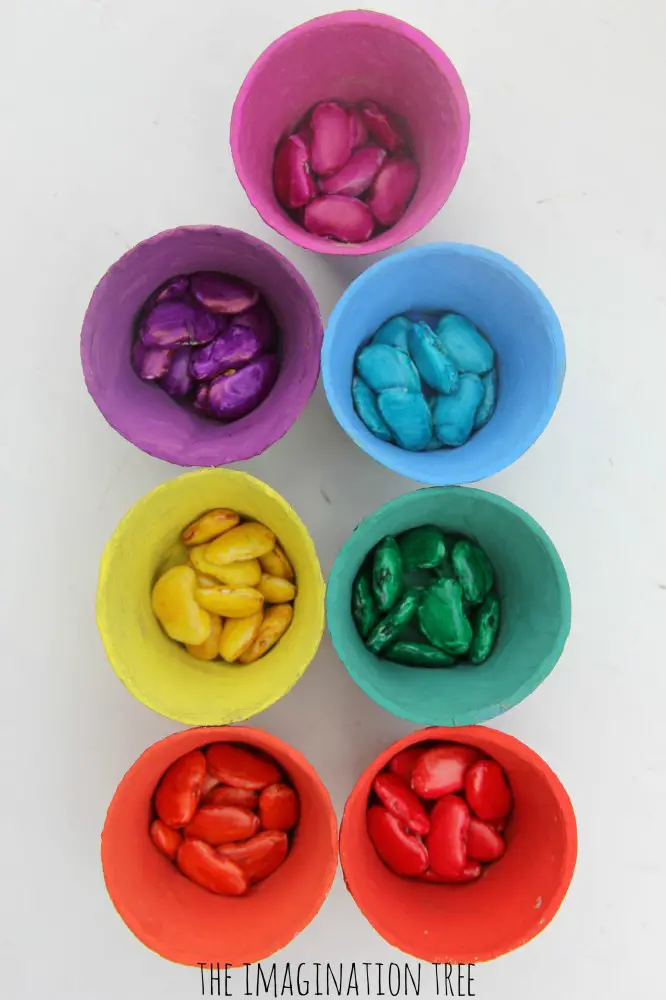 The original source of the activity, theimaginationtree.com, says that, although you have to get your hands messy with colorful markers while painting the beans and the cups, everything is justifiable to see kids happy!