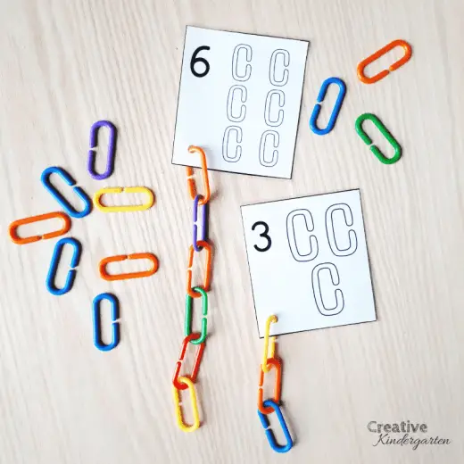 This exercise helps the numbers “materialize” into objects for visualization. It’s also easier to see if one number is larger than the other if you have links hanging from the card. We found the original idea on creativekindergartenblog.com.