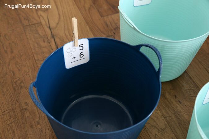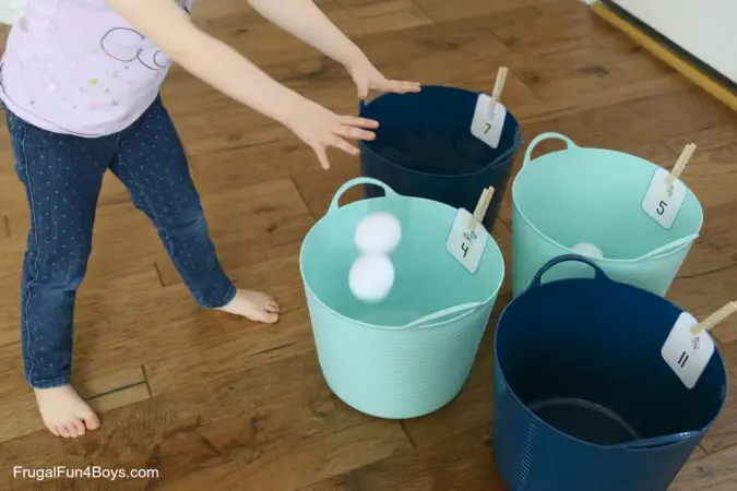 If the child is new to their counting journey, the game can be as simple as tossing up to ten “snowballs” into one bucket. In the future, you can have numerous twists on the game rules.