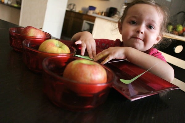 What is great about this activity is that it also offers a sensorial experience by having homemade apple-scented play dough for the kids to use alongside wooden numbers to make it all the more exciting for them.