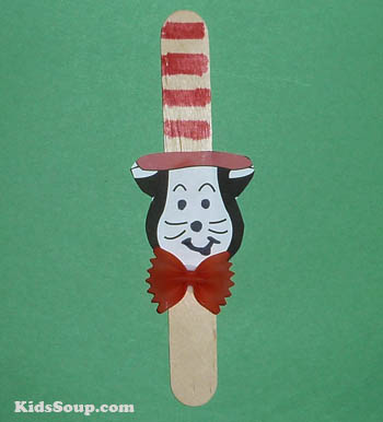 The cat face goes atop the craft stick using glue. Then using the red marker, you can draw stripes on the hat and then glue red bowtie pasta beneath the cat’s face.