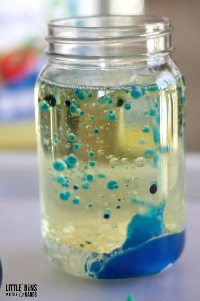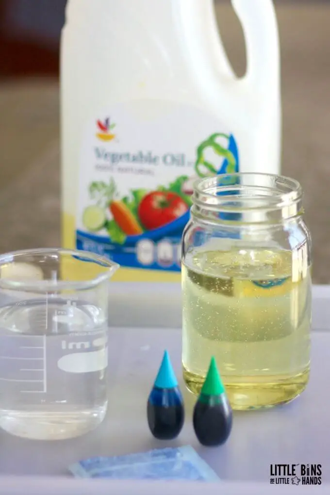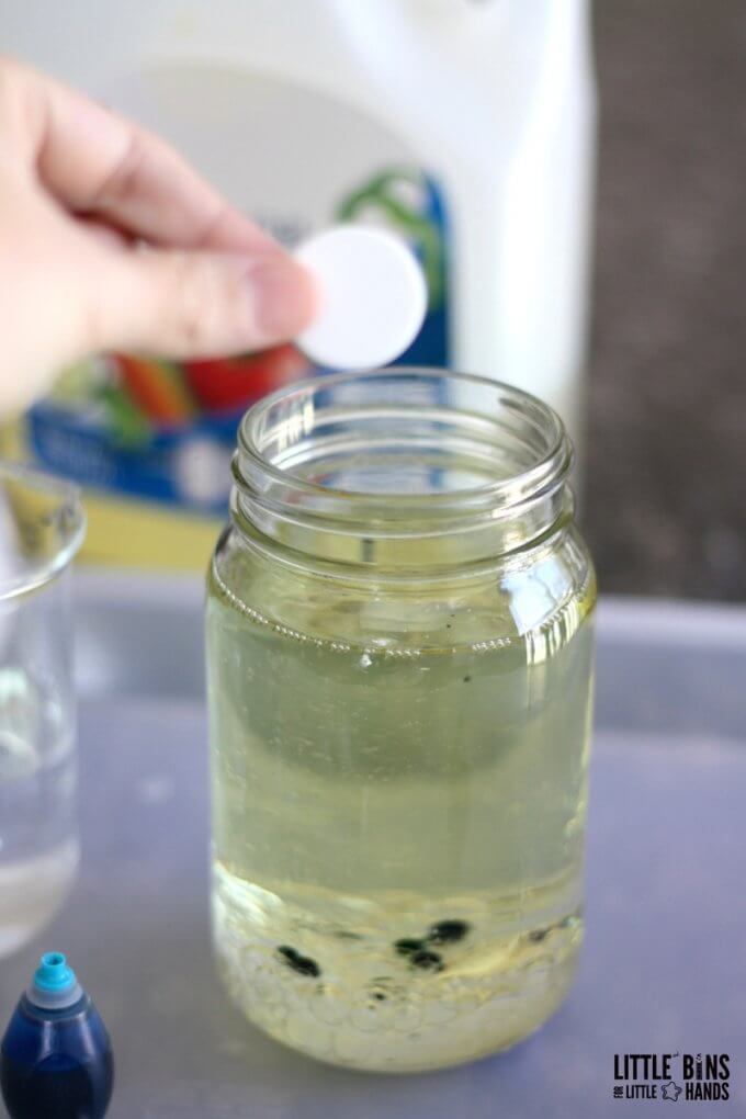 To start this activity, you will need a glass jar half-filled with oil. Add water and green and blue food coloring to this jar.