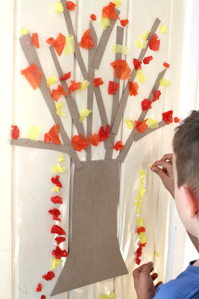 The kids will thoroughly enjoy sticking colorful tissue papers on the tree and making it appear vibrant just like during autumn.