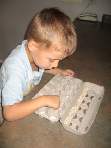 The idea is to reinforce the concept of numbers by writing a number inside each hole compartment of the carton, and the students have to add the correct number of beans according to the corresponding number in the hole.