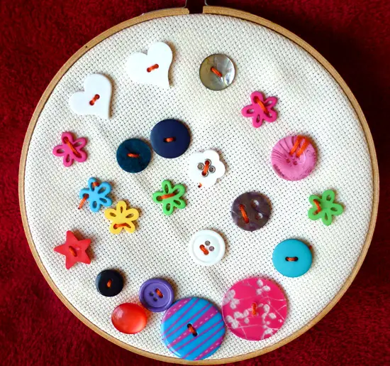 Also, make sure that the buttons have openings that are big enough for the children’s needle to easily slide through them. Burlap is a good fabric to use for this activity as the holes are visible, so students can easily pass the needle through, which wouldn’t be possible with regular fabric.