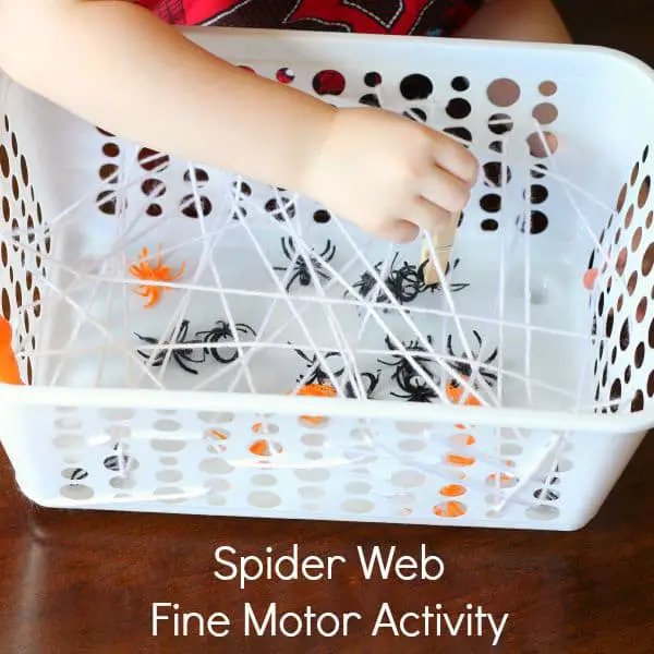 This spider web fine motor activity incorporates three basic tools: a basket, some yarn, and a few spider rings. Take the basket and wrap the yarn around it to form a web-like structure.