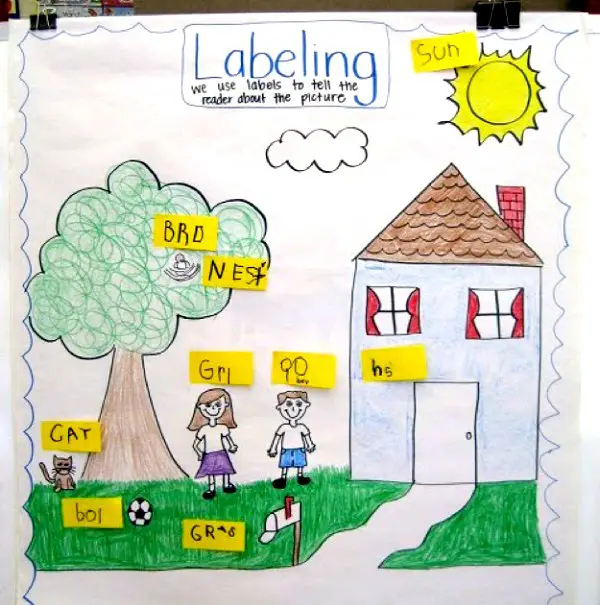 You can use charts with drawings or use smaller printouts that each child can individually label. Use stick-on labels, glue, or markers to label out everything. For smaller prints, labels can be premade, and the students simply have to stick these on.Â