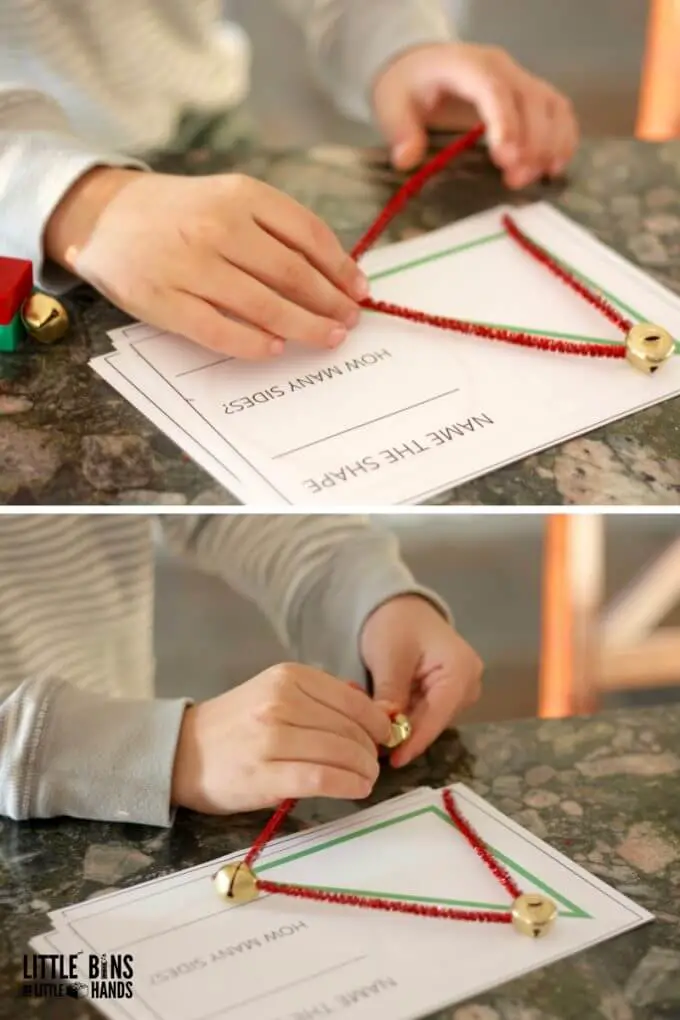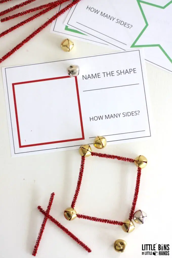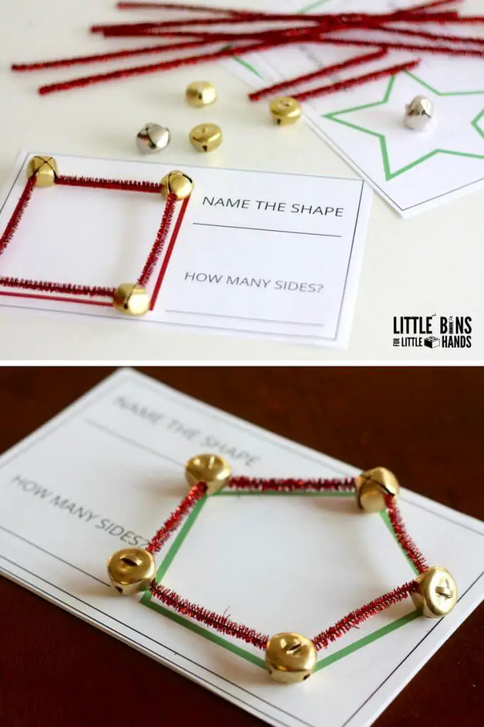 The items required for this activity includes jingle bells, printed shape on paper, and pipe cleaners.
