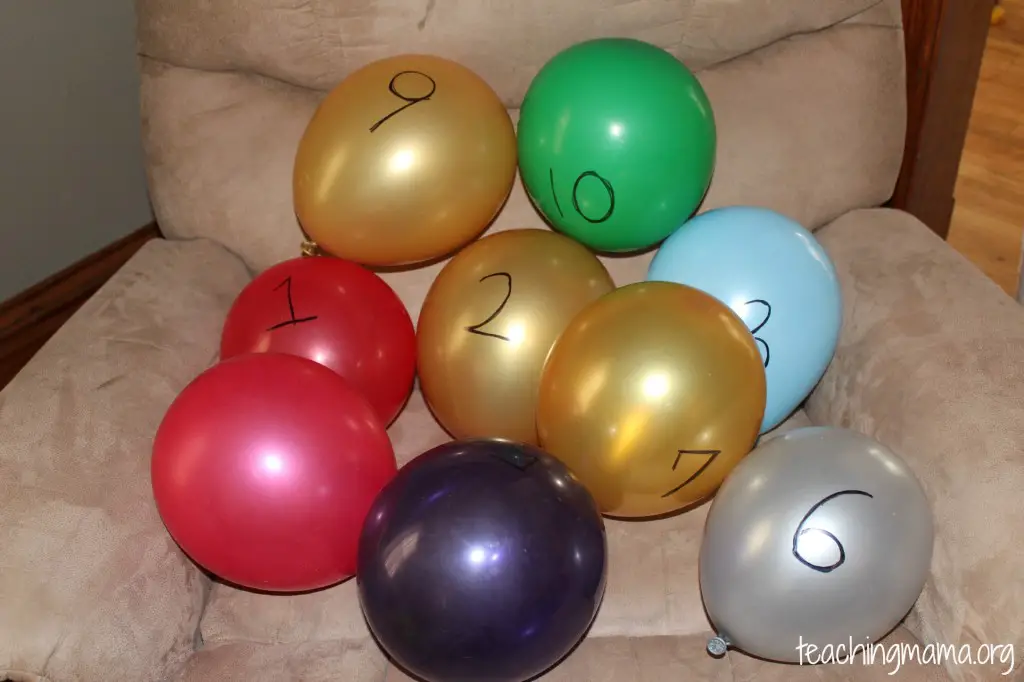 Take the balloons and number them from one to ten with a marker. Then hide them in the room, and ask the kids to find them. The only rule this activity has is to discover the balloons in descending order.