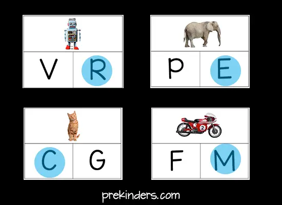 You can download printable cards that have a picture of the object, for example, an animal, and two alphabet options to choose from. The children will look at the picture and choose the alphabet with which the name of the object or thing starts.