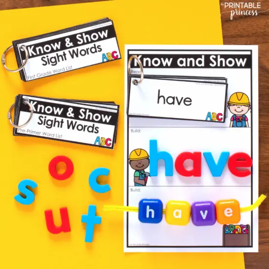 These playdough mats from EducationOutside allow children to build and spell sight words through sensory play. Each mat features one word from the Dolch primer list and lets the kid form, find by reading, tracing, and writing it. Therefore, this activity encourages not only word recognition but also fine motor skills development.Â