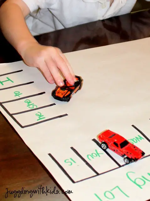 After that, you will say a word out loud to one of your students, and he or she will drive their way to that flashcard. Then they will tell you the word where they have parked their car. All the students will do the same on their turn and have a fun learning process.