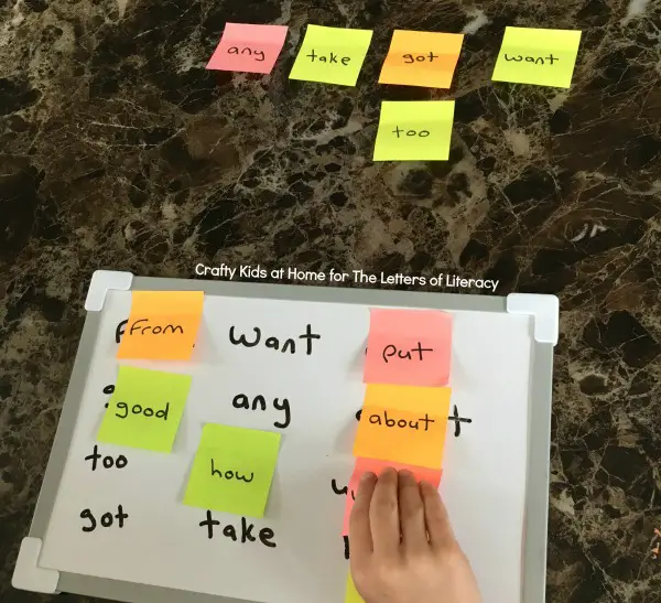 You can write different words on the class whiteboard and make sticky notes of each of those words. Then you can ask students to come one by one and cover a word they see on the board with the same word on the sticky note.