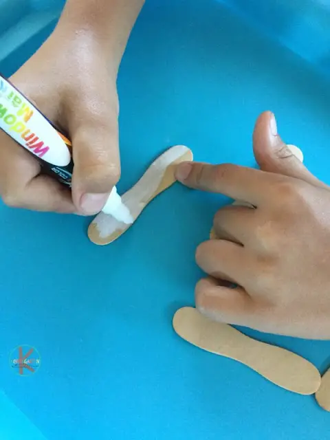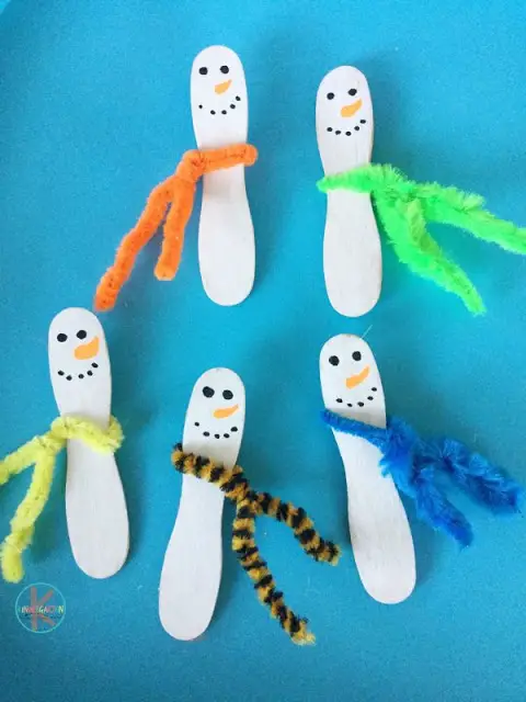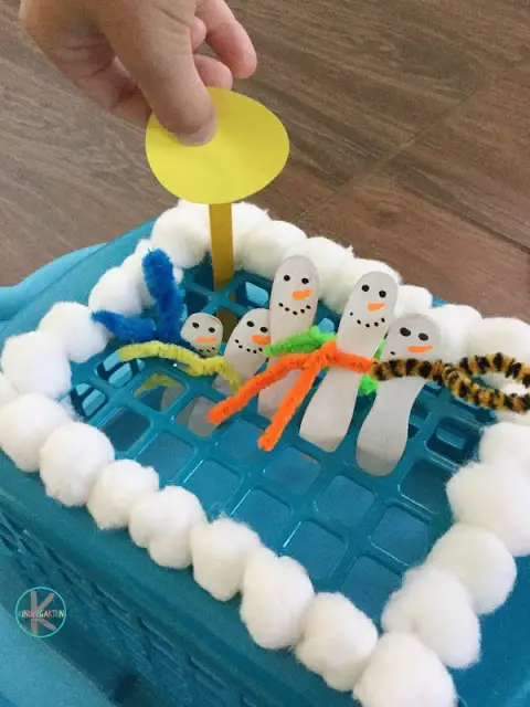 Then recite the poem, “five little snowmen standing at the door, one snowman melted, and then there were four.” Every time a snowman melts, the kids will push down one stick. This way, they will learn to count down from five to one and learn some rhymes along the way.