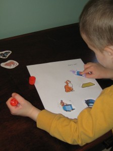 The word you say doesn’t have to be meaningful. Just make sure that it rhymes with something in the basket. The kids can also say the object name they choose out loud.