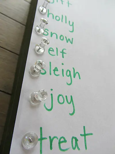 Next to each word, insert the push pins in. Make sure that they are secure and stable. You don’t want them flying out of the paper when you put the rubber bands around them. When you have placed the pins, you can start playing.