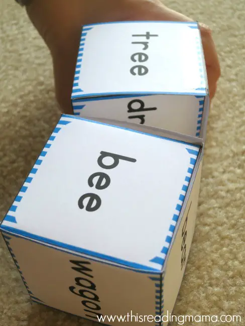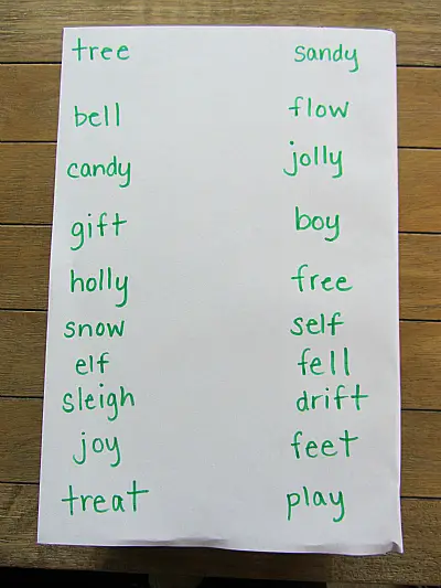 The difficulty level of the game can be easily customized. Along with rhyming, it helps with memory and learning word families (words with the same suffix or prefix). You can start with small words. Print the words on paper and cut them into small flashcards. These cards can have just words or both the word and its picture if it is a noun.