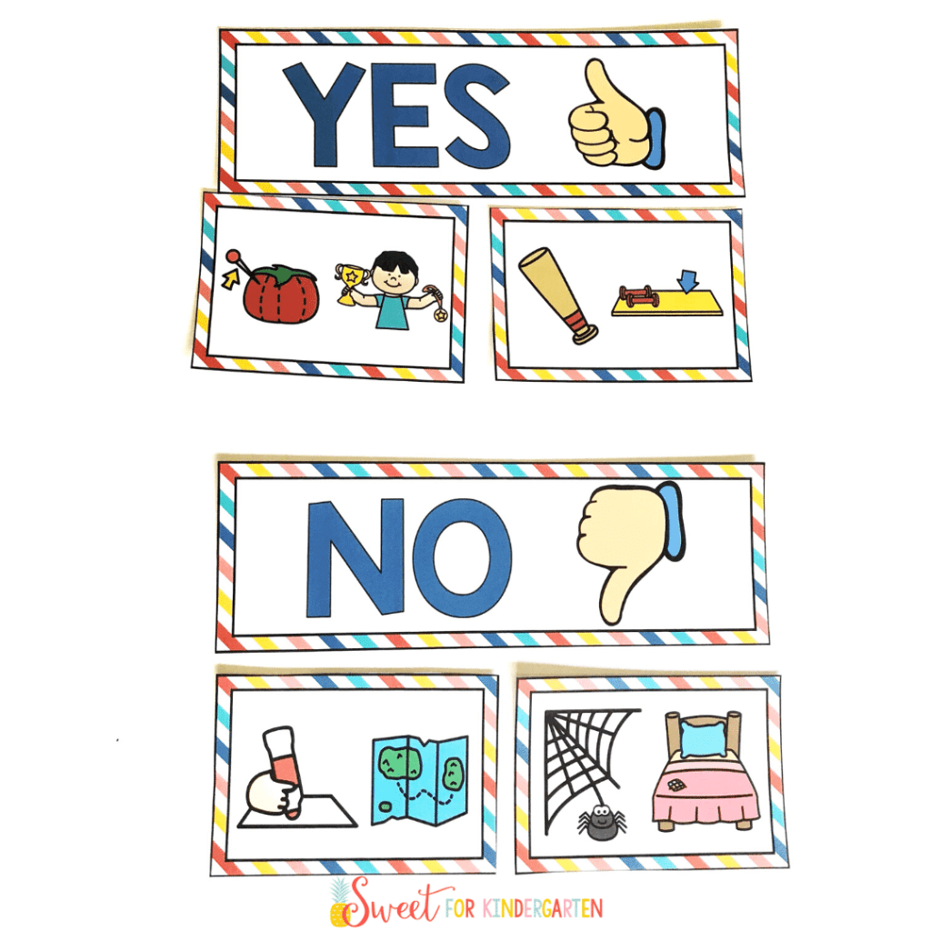 Place two words together and ask the kids if they rhyme or not. For a more interactive game, and if you are teaching a classroom full of students, you can ask them all to give a thumbs up if the words rhyme and a thumbs down if they don’t. You can also have cards for Yes and No.