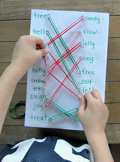 All you need is a paper, tape, push pins, elastic bands, and a marker or a pen. Compile a few different pairs of rhyming words and write one word from each pair on the left side and one word randomly on the right side of the paper. You should place this paper over a shoebox or some other box because you will be putting pins in it.