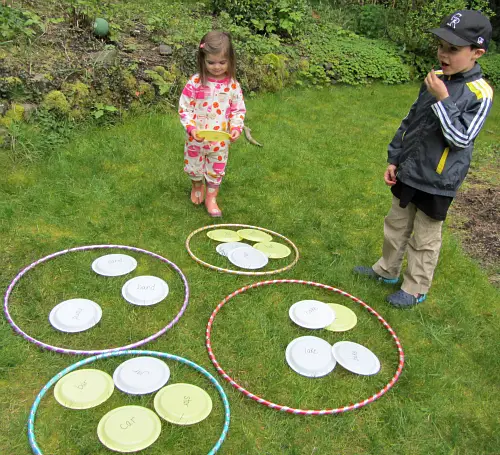 To play this game, you will need some hula hoops and paper plates. On the back of the plates, write rhyming words. If you want the game to go on longer, add lots of words. Take a few anchor words and place them on the ground inside hula hoops. Hide the rest in the garden or wherever you are playing.