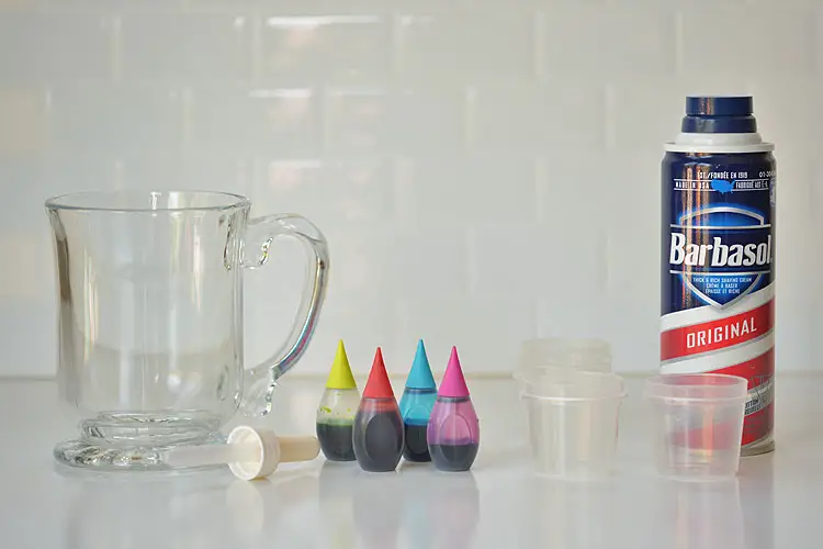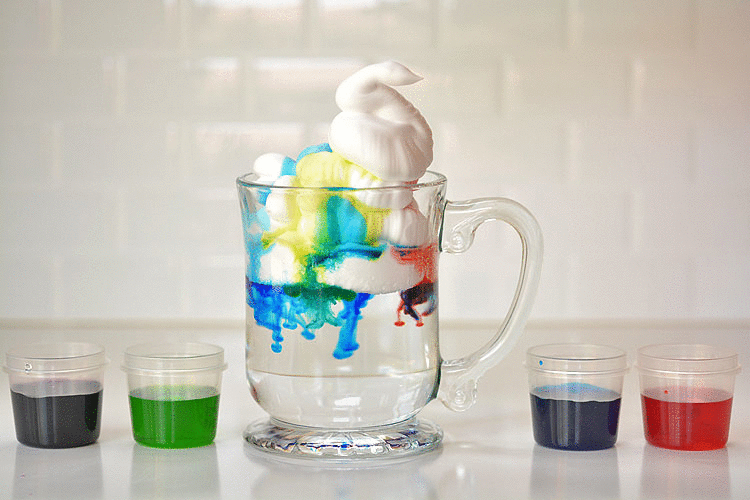 You will need some shaving cream, glass or clear plastic containers, and food coloring for this activity. Fill your container up to ¾ with water and top it with shaving cream. Add food color to the shaving cream. The color will start to fall like rain.