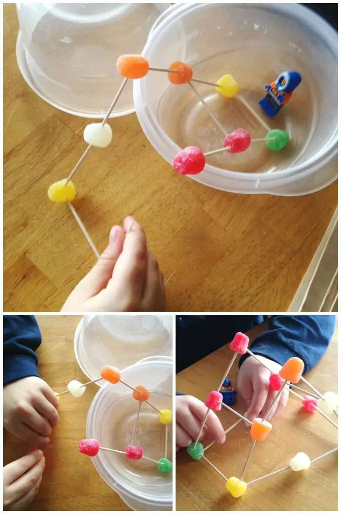 One such activity is this gumdrop bridge STEM game, which helps with fine motor skills. All you need for this game is gumdrop candy, toothpicks, legos, containers, and a bridge-building video.