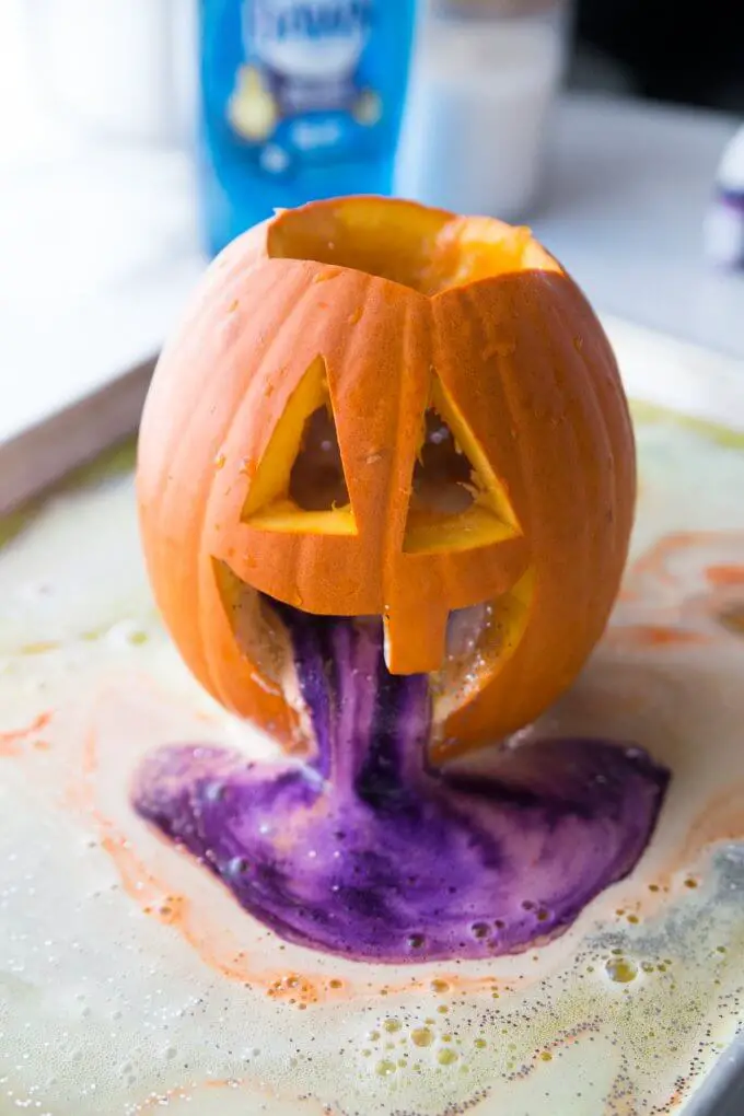 The puking pumpkin experiment can teach kids about chemical reactions. To do this experiment, you need to carve out a pumpkin face and a hole on the top. Since it can get very messy, place the pumpkin on something, like a tray or towel.