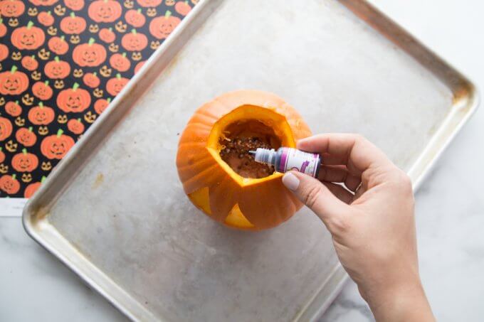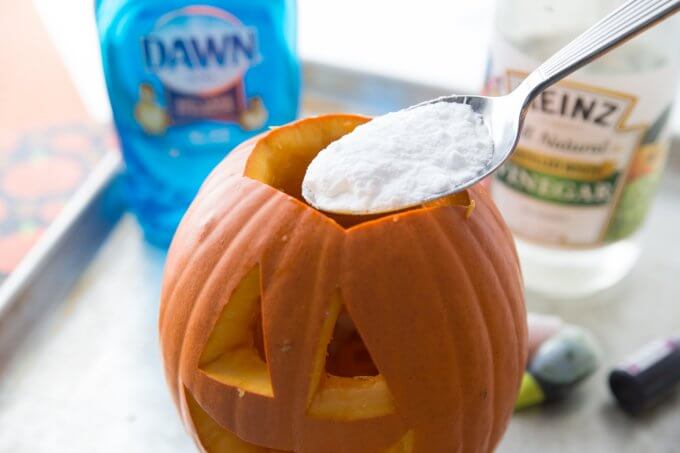 Try using a big pumpkin to see the effect. After carving and removing the guts from inside, put ¼ cup baking soda inside, then add some food color drops. You can use any color of your choice; this will make the “puke.”