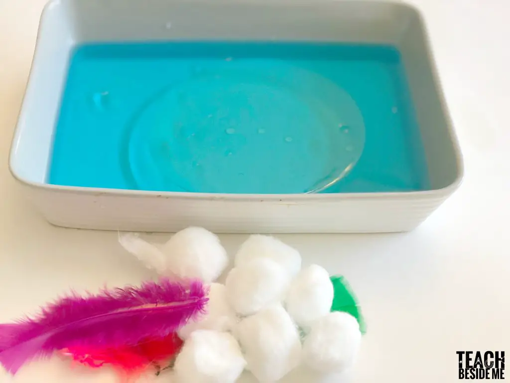 Kids can try to come up with ways of doing it, like spooning the water out. You can try to soak the oil with cotton balls. With the feathers, you can teach kids about how oil spills can affect birds because the oil gets stuck to feathers.