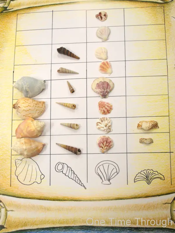 You can also print out a pictograph frame with drawings of the types of shells at one end, and the kids can stack similar shells together.