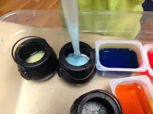 For this purpose, each child will need a pot, baking soda, and vinegar. You can help your child make his own cute little fizzing pot.