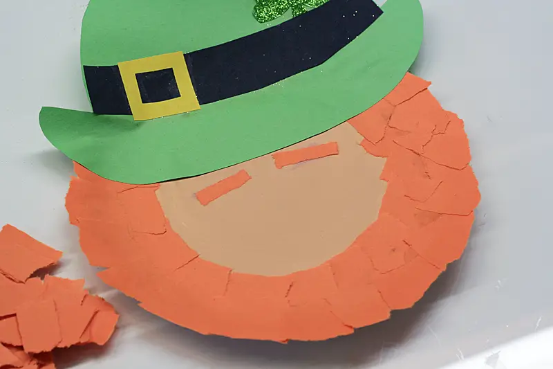 Start with turning the plate upside down and gluing an orange crepe paper for the leprechaun’s beard.