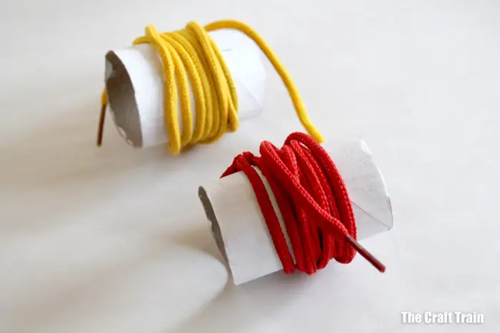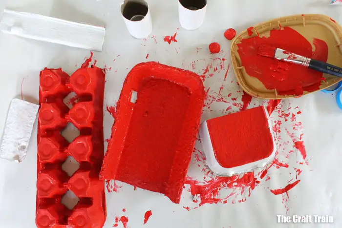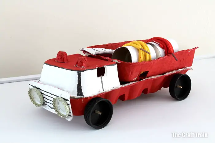 Have your child paint most of the carton red and the small piece for the windshield white. Paint the long, thin ladder pieces and toilet paper tubes white also. Using a marker, draw details for the ladder, windshield, and bumper once the paint is completely dry. Next, push the metal skewers through the egg carton to attach the wheels. Trim the skewer to the proper size and add the wheels. You’ll also need something to secure the wheels so they don’t slide off. Finally, roll shoelaces around the toilet paper rolls as hoses, and glue all the pieces together. When you’re done, you have a functional fire truck that is perfect for pretend play!