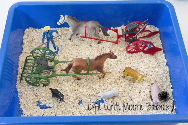 Sensory bins give kids the ability to play and feel various textures. This is an excellent way to let preschoolers explore the differences and also engage in pretend play. This farm sensory bin found on LifeWithMooreBabies.com can be filled with the medium of your choice. You can even customize it to the theme. Use corn kernels, rice, oatmeal, or soybeans to show things that grow on a farm.