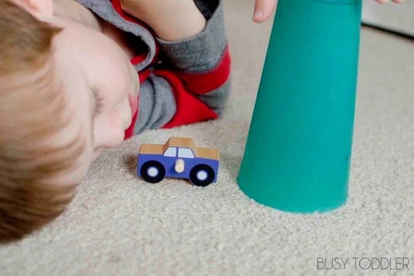 This game is super easy to set up and play and your kids will have a blast! All you need is a cup (or book or shoe or really anything…) and a small object.