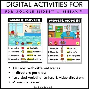 This activity is great for learning positional words and following multi-step directions. The audio and visual directions make it easy to follow and perfect for independent work or small group work. Plus, it’s a great way to review the material at the beginning of the year or for remediation preschoolers. Either way, your students will love it!