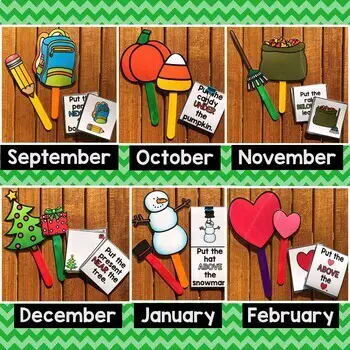 The Seasonal Positional Words Activity Pack is perfect for teaching your students about positional words. Each month has a pair of pictures for you to glue on popsicle sticks. Print out multiple copies to give your students a set during group work. All activities are also in black and white for your students to color or if you don’t have a color printer!