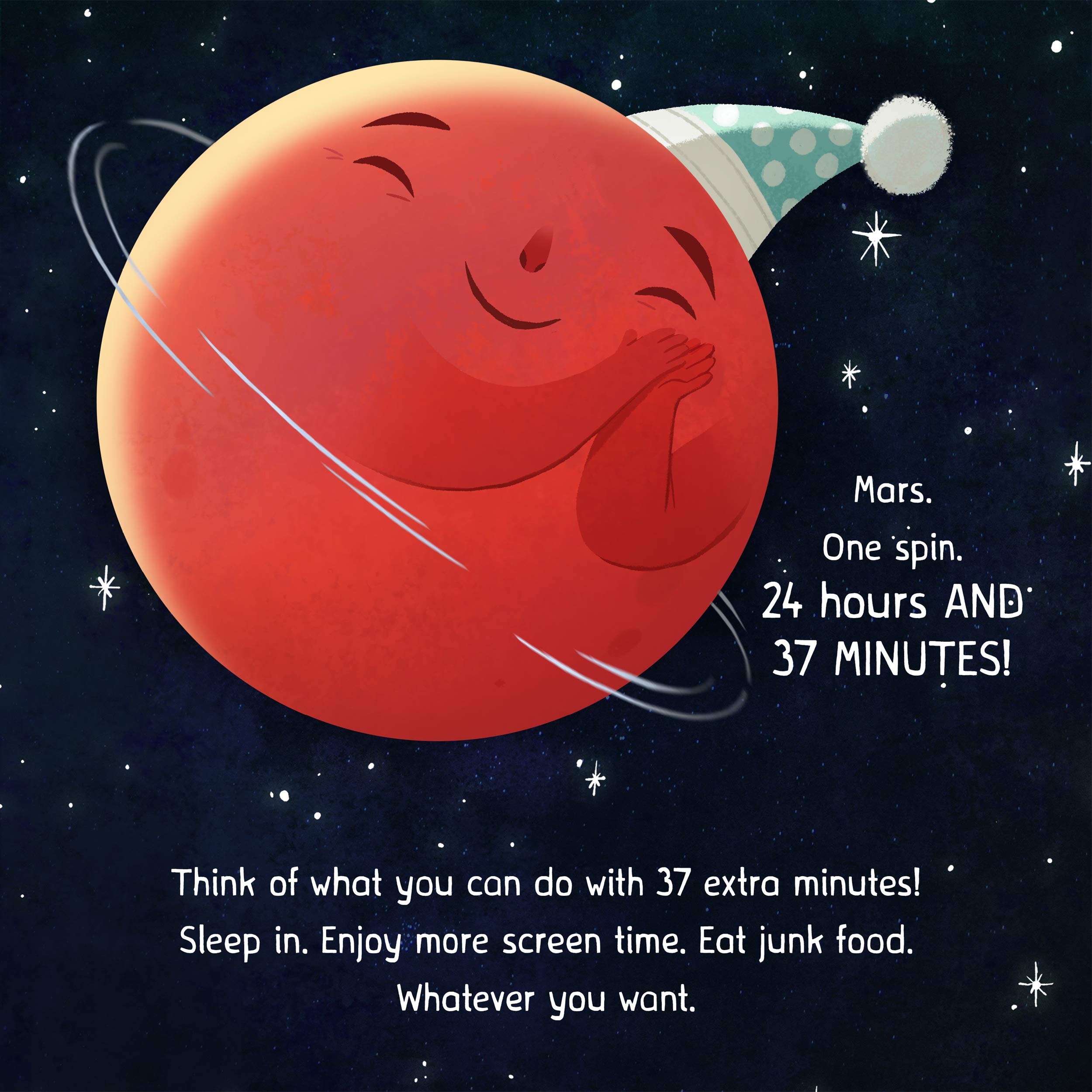 In the book, Magnificent Mars, a “party planet” as he claims, invites Earthlings to come visit and spend time with him as he wishes to be “the first planet with human guests.” To persuade the readers more, he enumerates his unique attractions—ranging from oceans, mountains, and two moons, to volcanoes deeper than Earth’s.