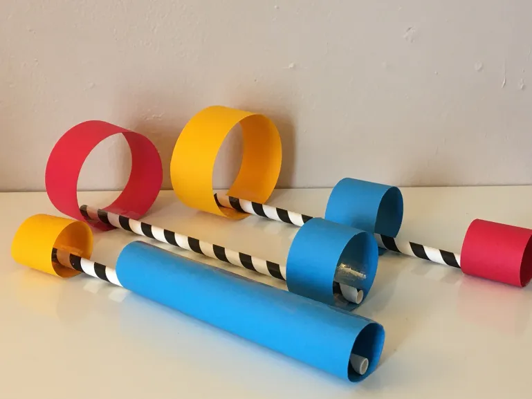 Cut two strips of light card or paper to the length and width you desire. Tape your strips to turn them into two hoops – one large and one small. Tape the loops to each end of the straw, and you’re done!