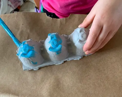 You will be using egg carton sections to show all four stages of the cycle – egg, larva, pupa, and adult. To make the ant eggs, simply coat an upside-down egg carton section with glue and stick on small white pom poms to create a pile of eggs.