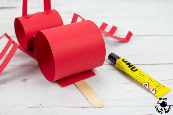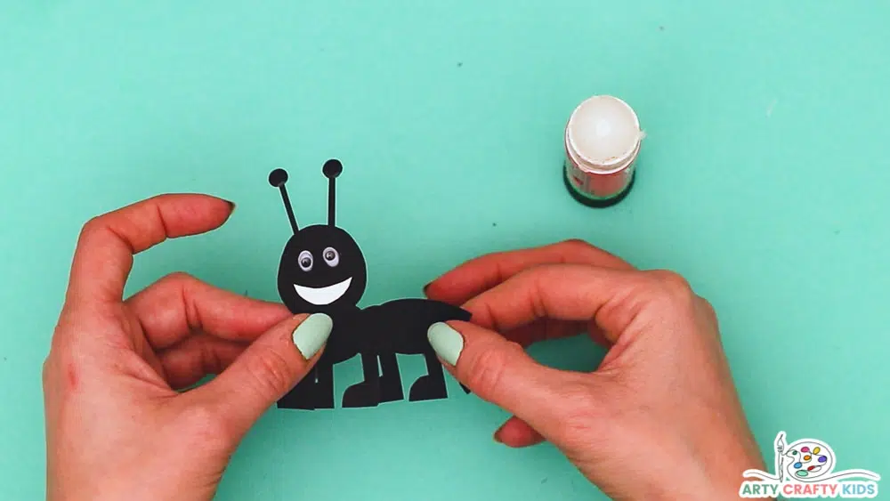 Next, cut out two shorter strips for the antennae and six strips twice the length of the antennae for the legs. Glue them on, attach googly eyes and draw a smile onto your ant. Lastly, the magic happens when you glue a jumbo craft stick onto the bottom to serve as a handle at the back that kids hold to control their paper ant puppet.