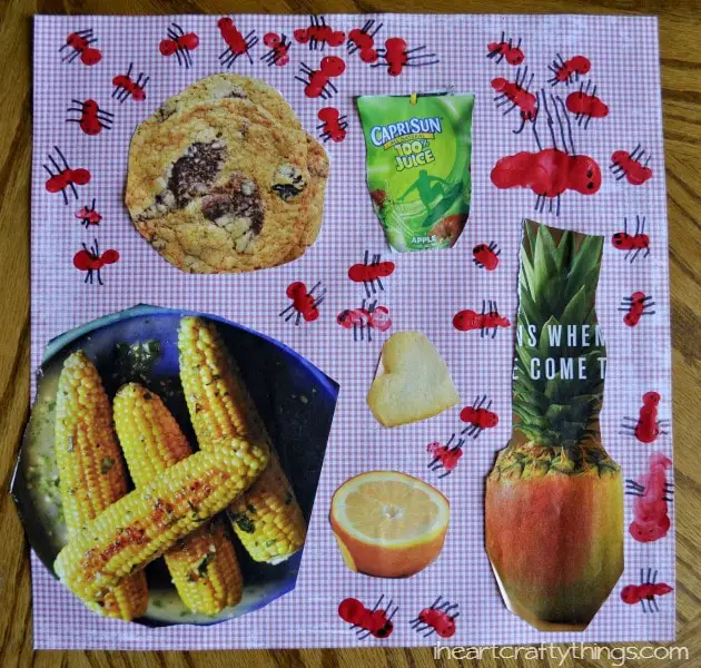 Begin by asking your kids to look through old magazines to find pictures of food they think ants would be attracted to. Cut, arrange and glue them onto your picnic blanket-looking scrapbook paper. Then they can now add ants all over the blanket using their painted fingertips (similar to our featured craft #2), and wait for it to dry. Once ready, have them add the details to the ants using a marker.
