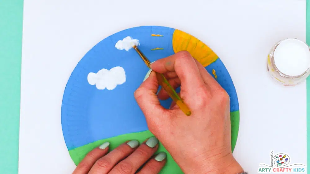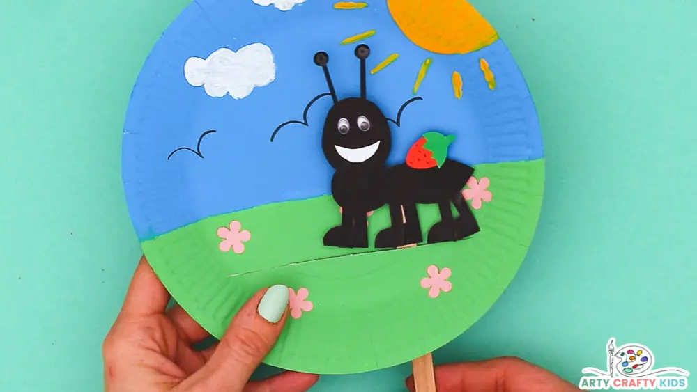 ArtyCraftyKids paper plate scene example features a sunny day, but you can use this opportunity to let kids’ imagination run wild and choose to create something different for their ant buddy. Once you’ve completed painting a scenery, you have an option to print the ant template the blog offers or draw the ant yourself onto the black cardstock/paper and cut it out. Then turn it into a puppet by securing a popsicle stick to its back and threading it through a slit in your paper plate.