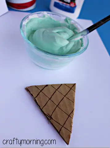 Shaving cream is an excellent material for texture and volume. It is a lot of fun to play with and also makes great 3D crafts like this one from CraftyMorning.com. Start by mixing shaving cream and white glue together until stiff peaks form. Add some food coloring or paint to achieve whatever color ice cream your child desires. Next, cut out a triangle from a piece of cardboard or brown construction paper and glue it to a piece of white cardstock.