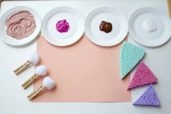 Using sponges to paint adds texture both to the finished product and the creative process. Kids love to touch things with various textures and see how those textures create different visuals. Grab some inexpensive sponges for this activity and cut them into triangle cone shapes. This is a great time to discuss the shapes and sizes of the sponges.