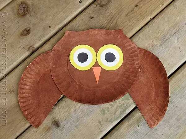 Glue the eyes and the triangle beak below them onto the center of one of your paper plates. Then cut out the other plate in half for the wings. Finally, make your owl more adorable by trimming the top of the paper plate to form two ears. You can also tape a piece of yarn to the back to hang your owl up if you wish.