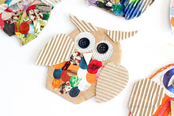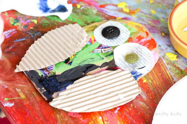For the owl wings and eyes, you may want to opt for contrast by using the textured part of your cardboard box the same as with ArtyCraftyKid’s clever idea. Then glue on the buttons as eye pupils, and from there, kids can continue decorating until they feel that their owls are complete and ready to be displayed in the house or classroom.