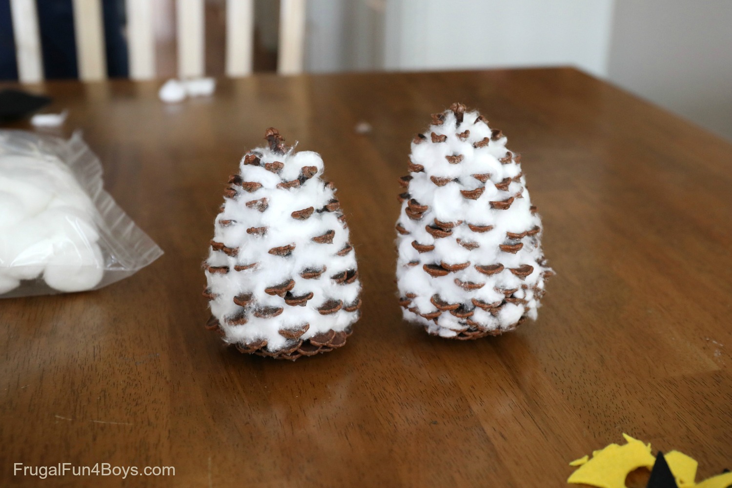 Have kids get started with pulling the cotton balls apart into smaller pieces and poking them in between cone scales. This serves as the owl’s body. Once your pine cone is fluffy and snowy enough, it’s time to attach the cutout parts: wings from white felt, a black felt beak, and googly eyes on top of yellow circle felt. And that’s it! You now have an adorable snowy owl perfect as seasonal home decor.