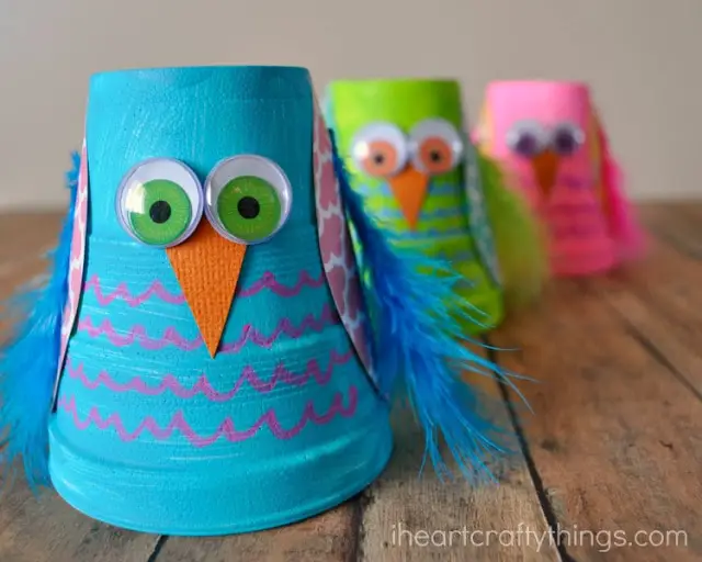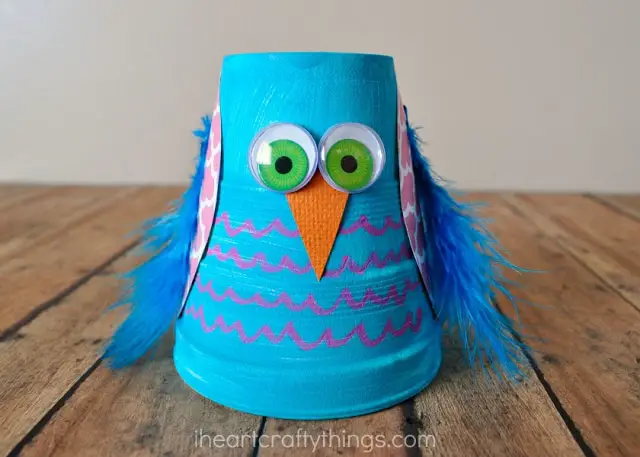 To recreate this, start by painting your Styrofoam cup on the outside and bottom. While waiting for it to dry, cut out two leaf-shaped wings from scrapbook paper and a triangle-shaped beak from the orange cardstock. Once your cup is ready, have fun using chalk markers to draw on scallop lines along the cup to look like owl feathers. Then finish it off by gluing on the pair of wings and feathers on each side of the cup, googly eyes, and beak.