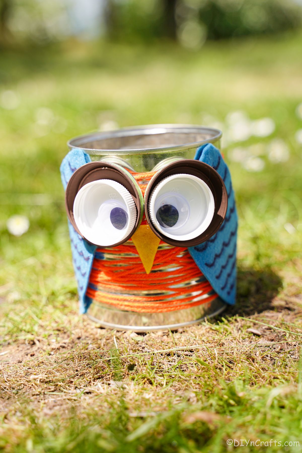 Now, it’s time to glue the owl parts! Attach the wings on either side of the can, the eyes assembled by gluing together the brown bottle cap, smaller cap, and googly eyes, and lastly, a beak cut out from yellow foam paper.